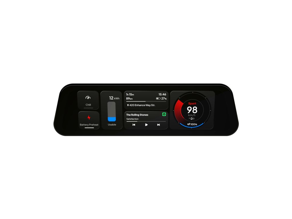 Displej lze přizpůsobit přes widgety, data rozložení a vzhled ukazatelů podle toho, co chceš vidět během jízdy. Můžeš si nastavit více úrovní displeje pro různé situace — standardní jízdu, autopilot, nabíjení nebo sportovní režim.